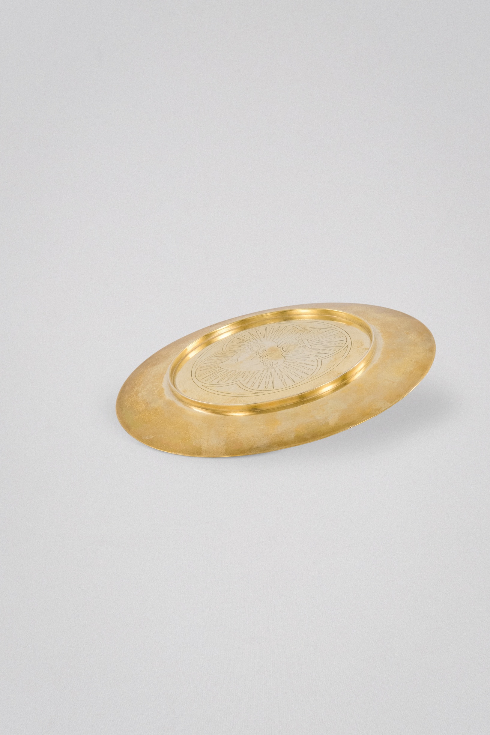 Patene mit graviertem Herz Jesu in einem Vierpass an der Unterseite.